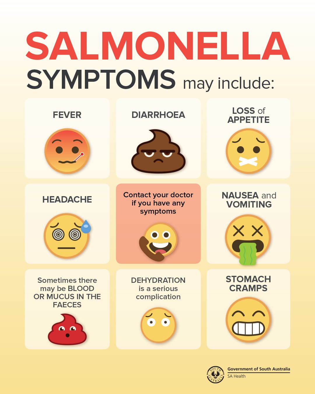 Salmonella Symptoms. Learn more about salmonella causes, symptoms, complications, treatment, and prevention. Salmonellosis is an infection with a bacteria called salmonella, salmonella live in the intestinal tracts of animals approximately 700 to 925 cases of salmonellosis are reported each year in minnesota. Symptoms of salmonellosis are relatively mild and patients will make a recovery without specific treatment in most cases. Others develop diarrhea, fever and. Salmonellosis is a symptomatic infection caused by bacteria of the salmonella type. Typically, people with salmonella infection have no symptoms. Other common symptoms of a salmonella infection include abdominal cramps and vomiting. Salmonella is one of the most common types of food poisoning caused by bacteria in the united states. Call the doctor for diarrhea lasting over 3 days, signs of dehydration, and fever over 102 degrees. The most common symptoms are diarrhea, fever, abdominal cramps, and vomiting. Salmonella are bacteria that can infect the intestinal tract, leading to diarrhea and other symptoms. Symptoms of salmonella include diarrhea (can be bloody), fever, and stomach cramps. Salmonella infection (salmonellosis) is a common bacterial disease that affects the intestinal tract. Salmonellosis is a disease caused by the bacteria salmonella. Salmonella infection can be the result of eating food tainted with bacteria, but there are other ways you can get it.